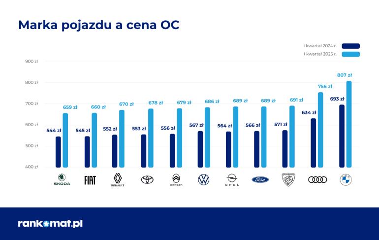Z zamieszczonej powyżej grafiki wynika natomiast, że w I kwartale 2025 roku właściciele Renault płacili średnio za OC 670 zł.