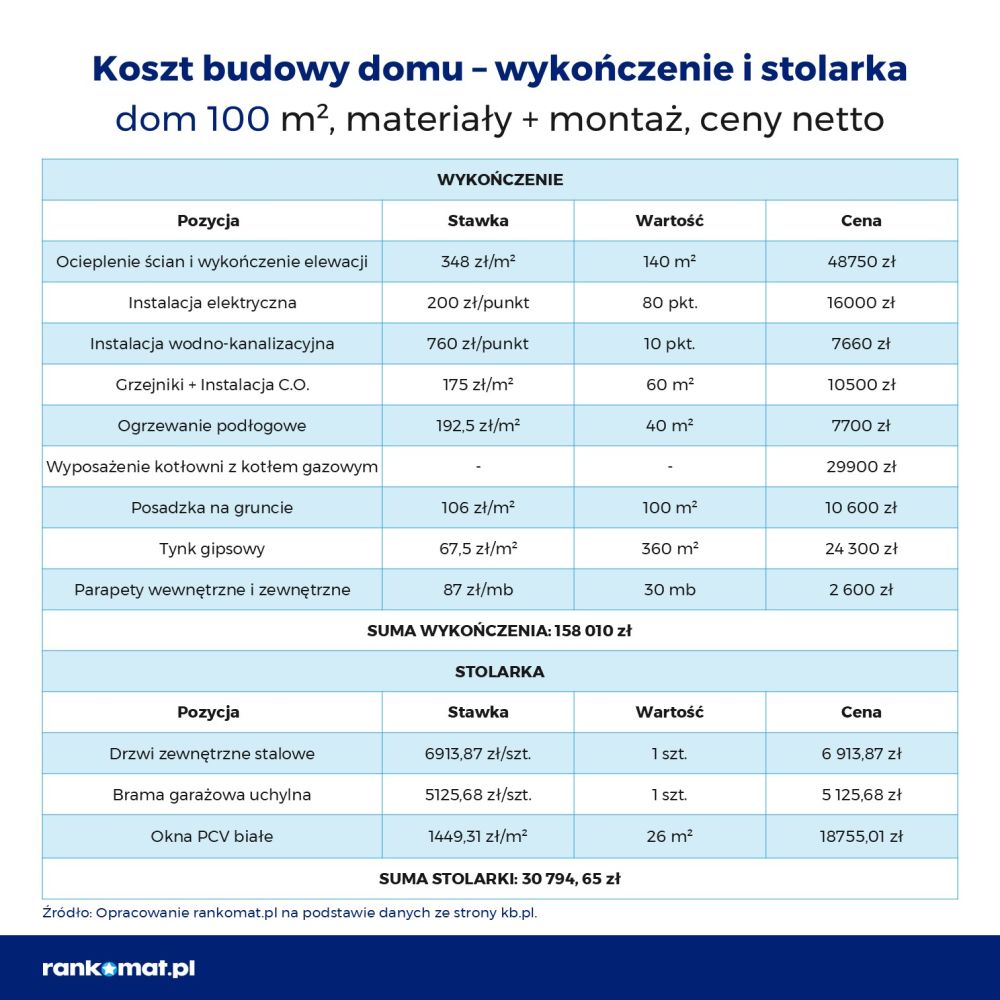 Podane kwoty należy powiększyć o VAT oraz wydatki nieuwzględnione w podstawowym kosztorysie: zakup działki, projekt budowlany, przyłącza, ogrodzenie, kierownika budowy, geodetę czy nadzór inwestorski. Eksperci zalecają także zabezpieczenie 10–15% rezerwy budżetowej na nieprzewidziane wydatki.