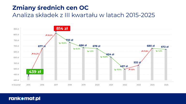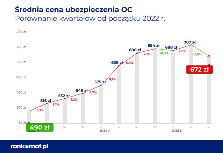 W III kwartale 2025 roku kierowcy płacili za OC średnio 672 zł – to o 8 zł (1,2%) mniej niż w analogicznym okresie ubiegłego roku. Spadek względem drugiego kwartału, który był najdroższy od 7 lat, wyniósł aż 35 zł (5%).