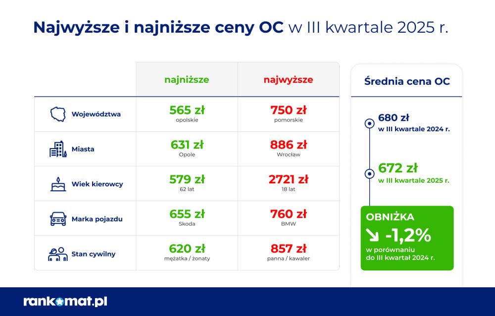 Z analizy cen OC porównywarki Rankomat.pl wynika, że w III kwartale 2025 r. najwięcej za obowiązkowe ubezpieczenie płacili kierowcy z Wrocławia (886 zł), Gdańska (866 zł) i Szczecina (813 zł). Towarzystwa ubezpieczeniowe proponowały najtańsze polisy OC mieszkańcom Opola (631 zł), Rzeszowa (651 zł) i Lublina oraz Kielc (po 701 zł). Różnica średnich cen OC między najdroższym miastem wojewódzkim a najtańszym wyniosła ponad 40%.