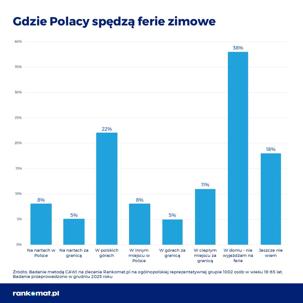 18% badanych nadal nie wie, co zrobi w czasie ferii. Spośród tych, którzy już planują wyjazd, najpopularniejszym kierunkiem są polskie góry (22%). Ponadto 11% wybiera ciepłe miejsca za granicą, a mniejsze grupy respondentów wskazały na narciarskie wyjazdy – zarówno w Polsce (8%), jak i za granicą (5%). Podobnie 8% zamierza spędzić ferie w innym miejscu w kraju, a 5% – w górach za granicą. W porównaniu z ubiegłym rokiem prawie trzykrotnie zwiększyła się liczba osób planujących wypoczynek w polskich górach oraz za granicą. Mimo to wciąż najliczniejszą grupą są osoby, które nie planują żadnego wyjazdu (38%).