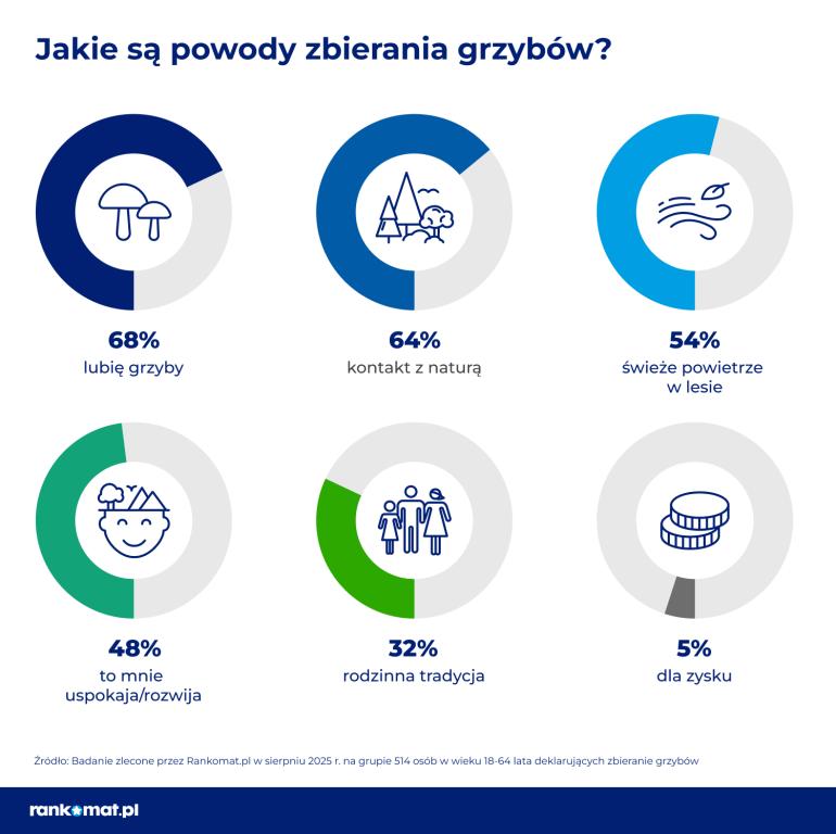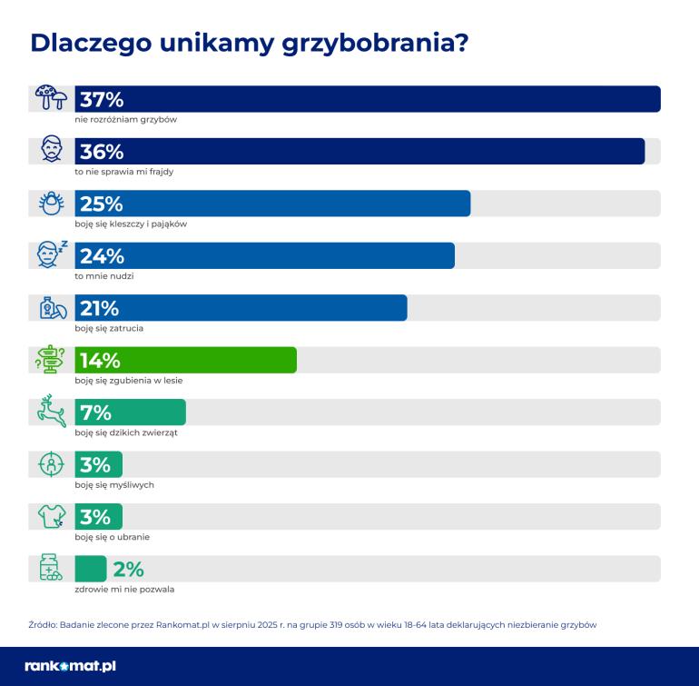 Grzybobranie to niekoniecznie narodowy sport Polaków. Badanie Rankomat.pl pokazuje, że prawie 40 proc. z nas unika zbierania grzybów w lesie, a głównym powodem jest nierozróżnianie gatunków jadalnych od trujących (37 proc.). Mimo że boimy się zatrucia grzybami, to jednak większy lęk przed wizytą w lesie powoduje obecność pająków i kleszczy. Zwolennicy grzybów, których jest ponad 60 proc., lubią to robić dla samych grzybów, kontaktu z naturą i świeżego powietrza, a zaledwie 5 proc. upatruje w grzybobraniu źródła dochodu.