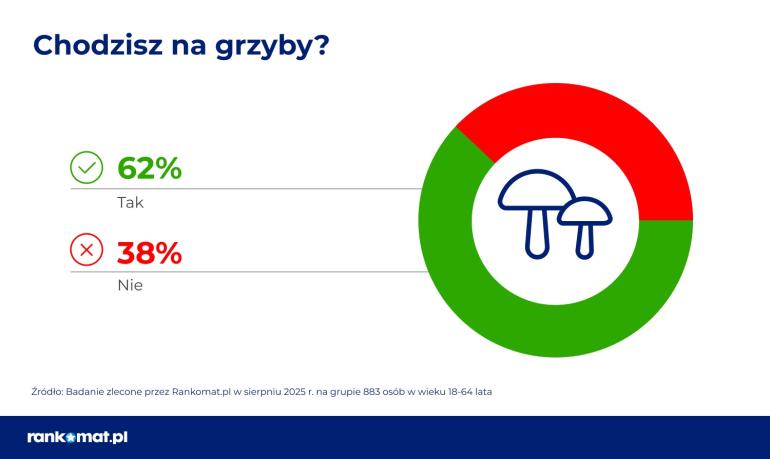 Z badania zleconego przez Rankomat.pl wynika jasno, że znacznie więcej jest zwolenników grzybobrania niż przeciwników. Jednak przewaga grzybiarzy (62 proc.) w stosunku do nie-grzybiarzy (38 proc.) wcale nie jest miażdżąca. Zwłaszcza że w powszechnej opinii grzybobranie jest uznawane za sport narodowy Polaków, dostęp do lasów w Polsce jest prawie nieograniczony, a Lasy Państwowe podają, że co roku zbiory grzybiarzy oscylują wokół 100 tys. ton grzybów.