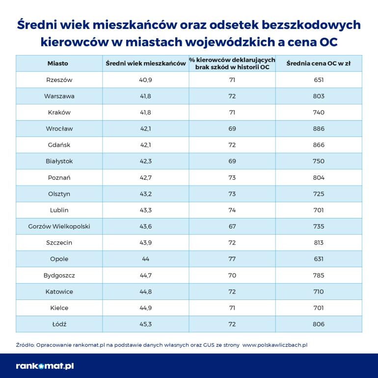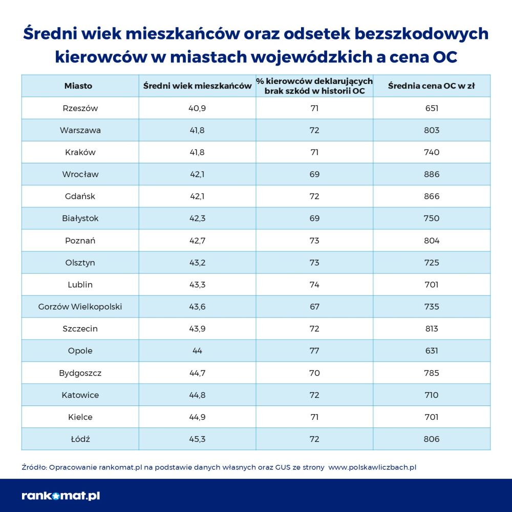 Choć natężenie ruchu i statystyki wypadków są ważne, dla ceny OC kluczowe pozostają wiek kierowcy i jego historia szkód. Doświadczeni kierowcy płacą średnio ponad 2 tys. zł mniej niż najmłodsi. Najwyższą średnią wieku mieszkańców mają Łódź (45,3), Kielce (44,9) i Katowice (44,8 roku). Najmłodsze populacje znajdziemy w Rzeszowie (40,9), Warszawie i Krakowie (po 41,8) oraz we Wrocławiu i Gdańsku (po 42,1). To właśnie we Wrocławiu i Gdańsku OC jest najdroższe.