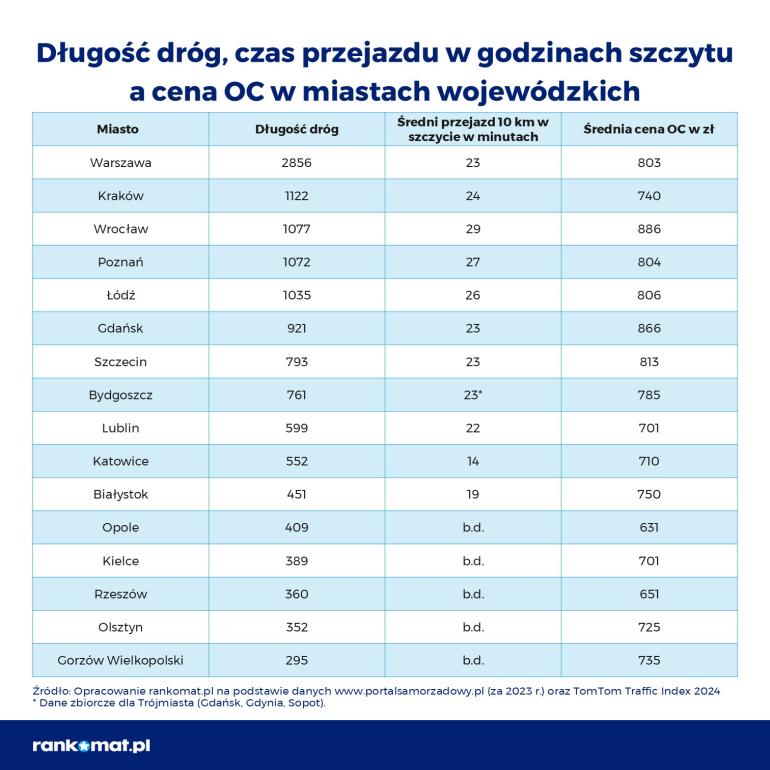 W rankingu są też: Kraków (105.), Warszawa (121.), Bydgoszcz (124.), Trójmiasto (125.), Szczecin (135.) i Lublin (166.), a także Białystok (233.), Bielsko-Biała (298.) i Katowice (396.). W tych ostatnich przejazd 10 km w szczycie trwa ok. 14 minut. Co istotne, lider polskiego zestawienia – Wrocław – ma jedne z najwyższych stawek OC, natomiast Katowice, kończące stawkę, należą do najtańszych. Widać więc, że natężenie ruchu realnie przekłada się na cenę obowiązkowej polisy.