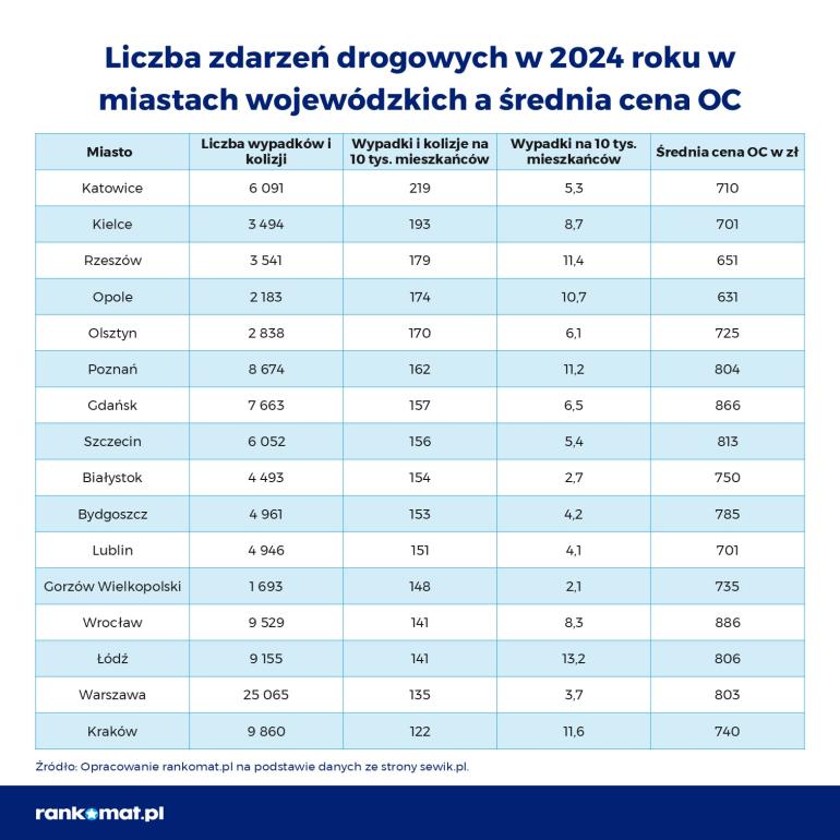 Najwięcej zdarzeń drogowych w przeliczeniu na 10 tys. mieszkańców odnotowują Katowice i Kielce – około 200 rocznie. Paradoksalnie, należą jednocześnie do najtańszych miast pod względem obowiązkowej polisy OC obok Opola. To ośrodki z relatywnie starszą populacją i mniejszą siecią dróg niż np. najdroższy pod względem OC Wrocław, co także wpływa na ryzyko i finalną składkę. Rankomat.pl przeanalizował miasta wojewódzkie pod kątem średniej ceny OC, liczby wypadków i kolizji, długości sieci dróg oraz wieku mieszkańców, a nawet deklaracji bezszkodowości. Dzięki temu jasno widać, że wysokość obowiązkowej polisy komunikacyjnej to nie przypadek, lecz suma warunków lokalnych.