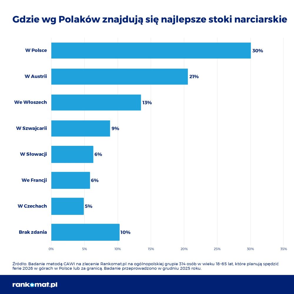 30% Polaków uważa, że najlepsze warunki do jazdy na nartach i snowboardzie panują w Polsce, ale aż 60% wskazuje zagraniczne kurorty – głównie w Austrii (21%), Włoszech (13%) i Szwajcarii (9%). Z badania Rankomat.pl wynika jeszcze, że dla 50% narciarzy kluczowe przy wyborze tras zjazdowych jest bezpieczeństwo na stoku, a 41% wybiera kurorty z długimi trasami. Tymczasem na polskich stokach najbardziej narzekamy na brak długich i licznych tras (40%), ubogą ofertę dla dzieci (37%) oraz brak przepustowych wyciągów (34%).