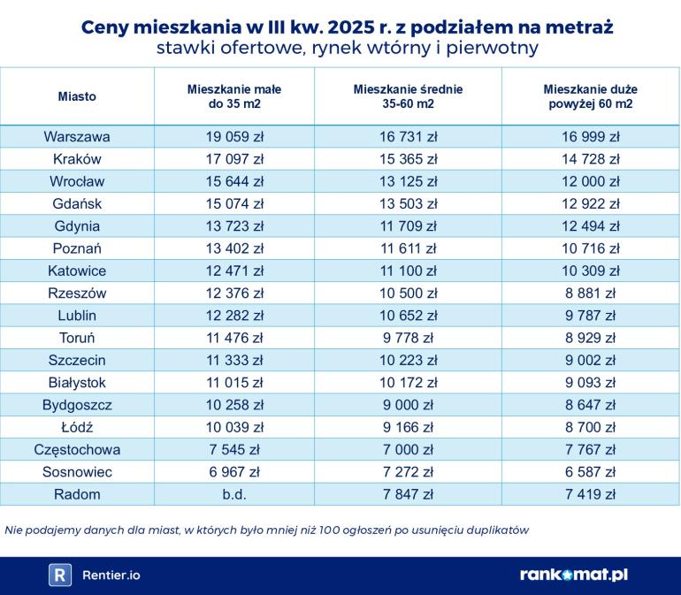 W 17 dużych miastach Polski ofertowe ceny mieszkań są bardzo zróżnicowane. Dla mieszkania o powierzchni 50 m² wynoszą od 7 000 zł w Częstochowie do 16 731 zł w Warszawie. W większości miast cena metra kwadratowego przekroczyła psychologiczną barierę 10 000 zł/m². Wyjątkiem pozostają Radom (7 847 zł/m²), Sosnowiec (7 272 zł/m²) i wspomniana Częstochowa. Do grona „dziesięciotysięczników” zbliżają się trzy kolejne miasta – Toruń (9 778 zł/m²), Łódź (9 166 zł/m²) i Bydgoszcz (9 000 zł/m²).