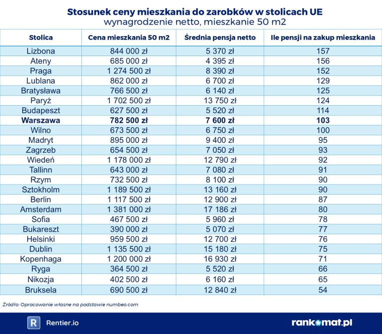 W Warszawie potrzeba aż 103 pensji, by kupić 50-metrowe mieszkanie. Gorzej jest tylko w siedmiu innych stolicach, m.in. Bratysławie (125) i Pradze (152). Najmniej korzystnie dla kupujących wypada Lizbona, gdzie trzeba przeznaczyć aż 157 wypłat netto, by nabyć mieszkanie średniej wielkości.