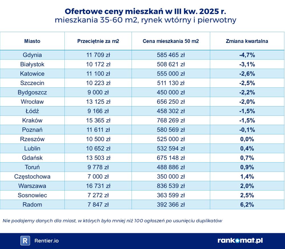 W porównaniu z II kwartałem 2025 r. mieszkania średniej wielkości potaniały w 9 z 17 badanych miast (od 4,7 proc. w Gdyni do 0,1 proc. w Poznaniu), a w 7 podrożały (od 0,4 proc. w Lublinie do 6,2 proc. w Radomiu). W Rzeszowie ceny pozostały bez zmian.