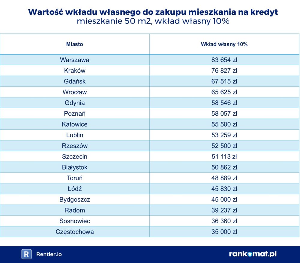 Zakup mieszkania dla większości Polaków możliwy jest głównie za pośrednictwem banku. W większości przypadków bank, udzielając kredytu, wymaga co najmniej 10-procentowego wkładu własnego. W zależności od miasta kwota ta różni się znacząco. W Częstochowie na zakup mieszkania o powierzchni 50 m² w III kw. 2025 r. wystarczyło 35 tys. zł wkładu własnego. Mniej niż 50 tys. zł potrzebne było również w Toruniu, Łodzi, Bydgoszczy, Radomiu i Sosnowcu.