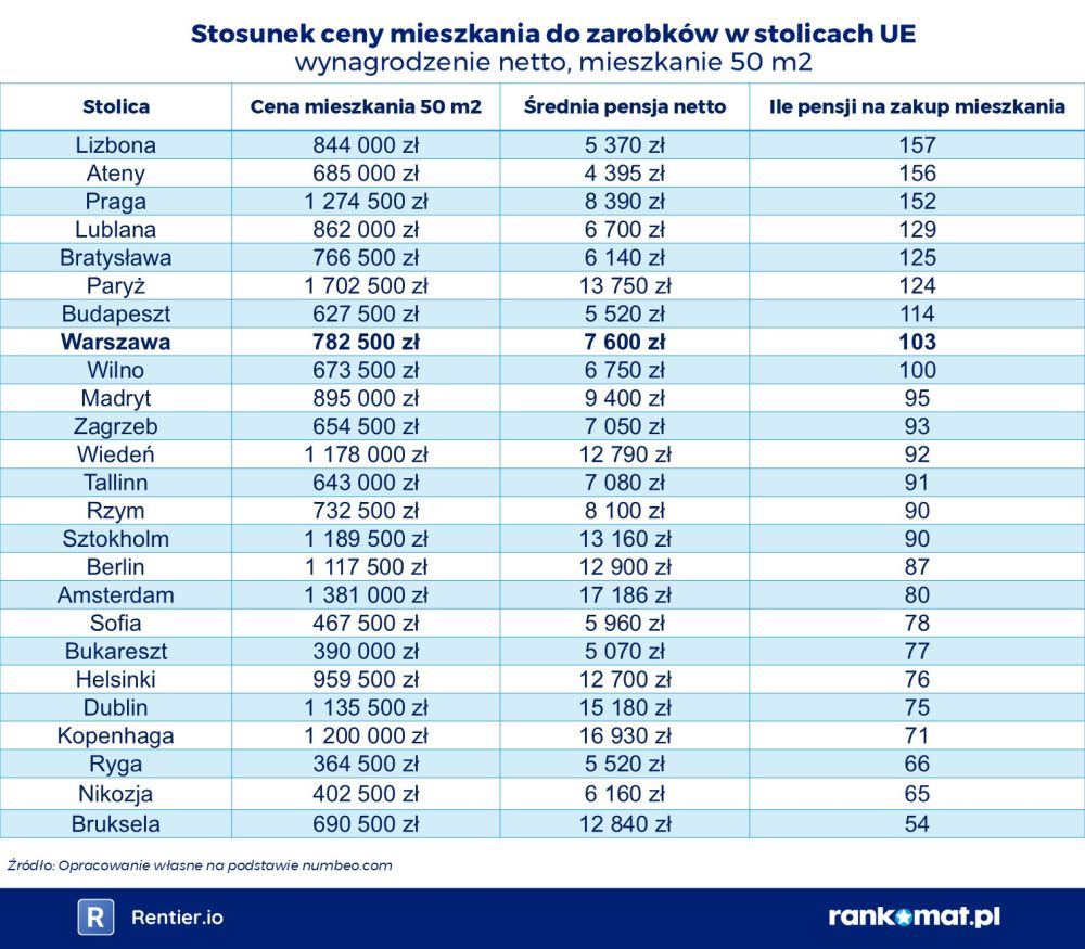 Na przeciwnym biegunie znajduje się stolica Belgii. W Brukseli zarabia się niemal tyle, ile wynosi cena metra kwadratowego mieszkania poza centrum, co oznacza, że wystarczą 54 pensje, by sfinalizować zakup. W porównaniu zaskakująco dobrze wypadły także stolice Cypru (65 pensji) i Łotwy (66).
