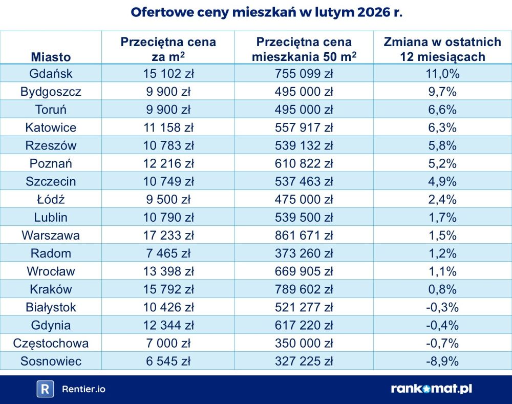 Zmiany cen ofertowych w ostatnich miesiącach były zwykle niewielkie. Wśród analizowanych miast można jednak wyróżnić trzy wyjątki. Znaczące wzrosty odnotowaliśmy w Gdańsku (+11% r/r) oraz Bydgoszczy (+9% r/r). W Gdańsku, po wspomnianym wzroście, średnia cena osiągnęła rekordowy poziom 15 102 zł za m². Z kolei wyraźne spadki cen odnotowaliśmy w Sosnowcu (-8,9%).