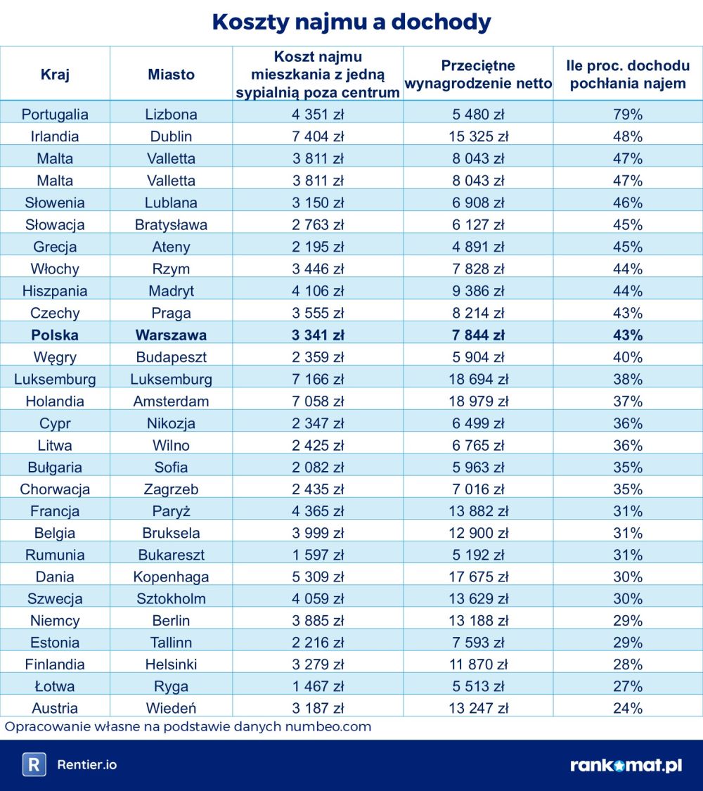 W Warszawie na ten cel trzeba przeznaczyć 43% dochodu. To wynik zbliżony do Pragi i Madrytu. W większości stolic krajów UE sytuacja jest jednak korzystniejsza – Warszawa zajmuje dopiero 18. miejsce na 27 badanych miast. W pięciu stolicach udział kosztów najmu w dochodach nie przekracza 30%: w Wiedniu, Rydze, Helsinkach, Tallinnie i Berlinie. Na drugim biegunie znajduje się Lizbona, gdzie koszt najmu pochłania aż 79% dochodu. Drugie miejsce od końca zajmuje Dublin (48%), a trzecie – maltańska Valletta (47%).