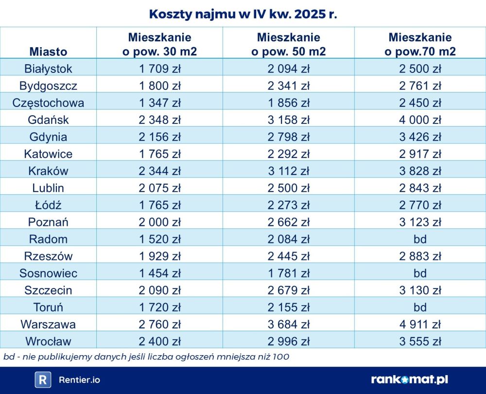 Rok 2025 był kolejnym z rzędu, w którym koszty najmu w większości miast zmieniały się jedynie nieznacznie. Dla przykładu, w IV kw. 2024 r. koszt najmu mieszkania o powierzchni 30 m² we Wrocławiu wynosił 2 382 zł miesięcznie. Rok później, czyli w IV kw. 2025 r., było to 2 400 zł, co oznacza wzrost o zaledwie 18 zł. Co ciekawe, mimo tego wzrostu koszt najmu był nadal nieco niższy niż w IV kw. 2022 r. W praktyce stawki najmu w IV kw. 2025 r. zwykle były zbliżone do poziomu sprzed trzech lat.