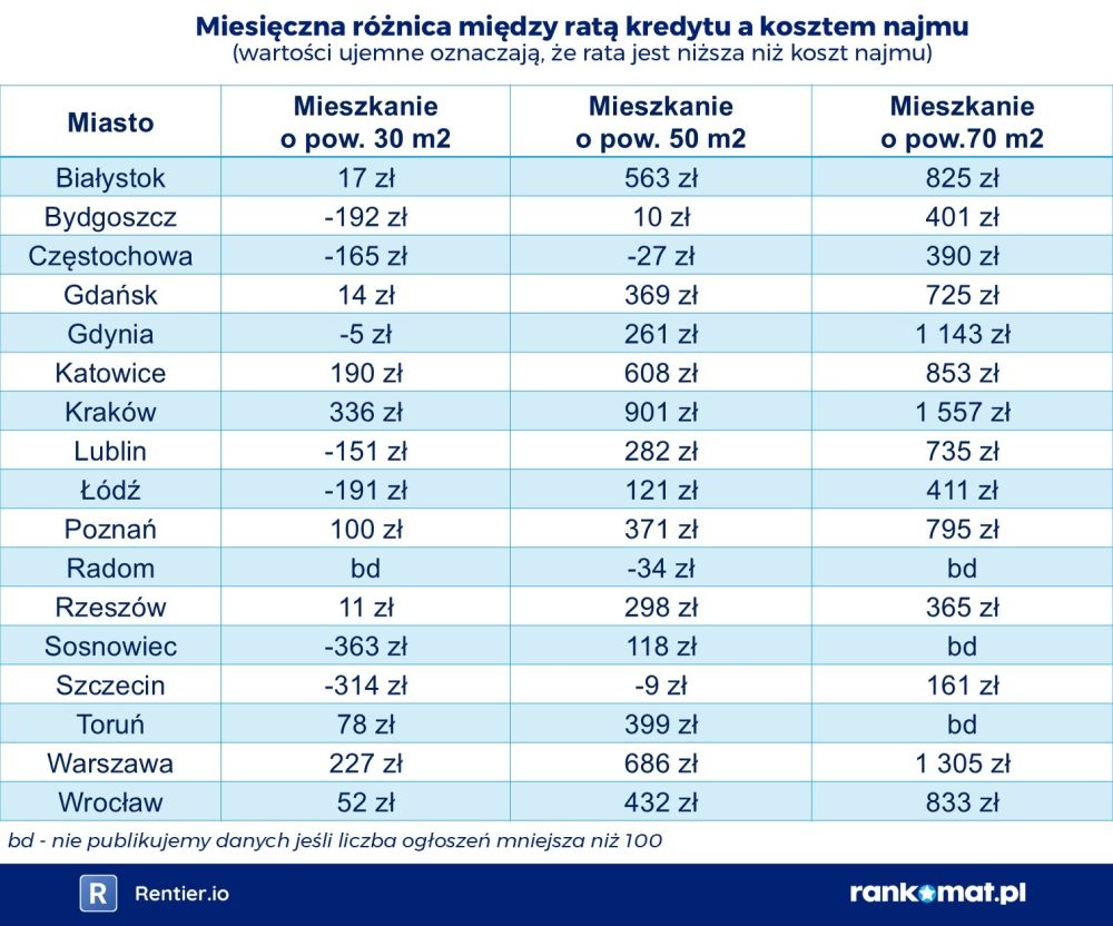 W przypadku małych mieszkań (do 35 m²) już w 7 z 17 badanych miast rata kredytu (przy wkładzie własnym 10%, na 30 lat) jest niższa niż koszt najmu. Dla przykładu w Łodzi najem mieszkania o powierzchni 30 m² kosztuje przeciętnie 1 765 zł miesięcznie, podczas gdy rata kredytu na takie samo mieszkanie wynosi 1 573 zł. Przeniesienie się z najmu do własnego lokalu oznacza więc oszczędność 191 zł miesięcznie. W 6 miastach rata jest tylko nieznacznie wyższa od kosztu najmu. Raty wyższe o ponad 100 zł od kosztu najmu występują jedynie w Krakowie, Warszawie i Katowicach.