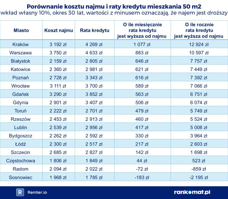 Najem mieszkania 50 m2 w III kw. 2025 r. kosztował przeciętnie od 1806 zł w Częstochowie do 3750 zł w Warszawie, nie wliczając rachunków. Dla porównania, rata kredytu takiego mieszkania wahała się od 1785 zł w Sosnowcu do 4633 zł w Warszawie. Pomimo obniżek stóp procentowych najem był w tym okresie wciąż tańszy niż rata kredytu aż w 15 z 17 analizowanych miast. Różnica na korzyść najmu wyniosła od zaledwie 44 zł w Częstochowie do aż 1077 zł w Krakowie.