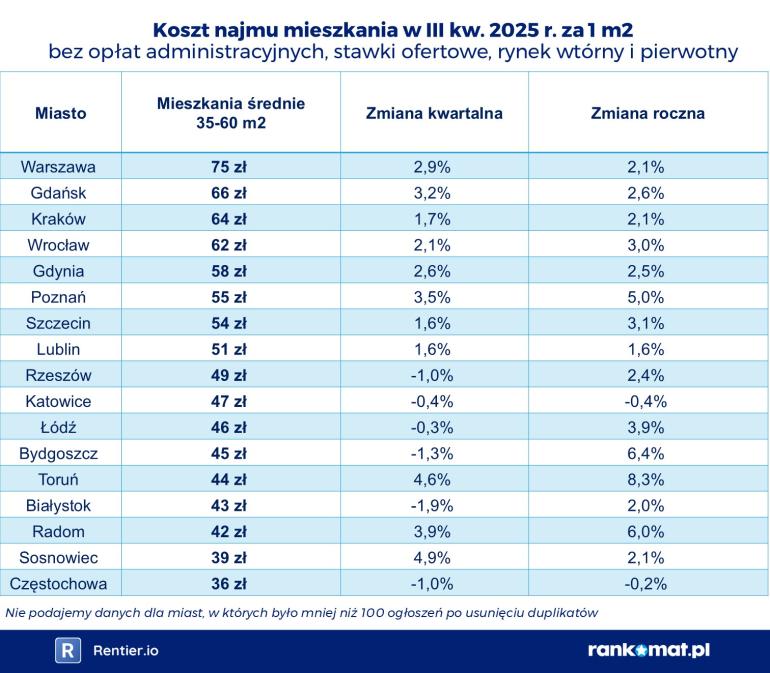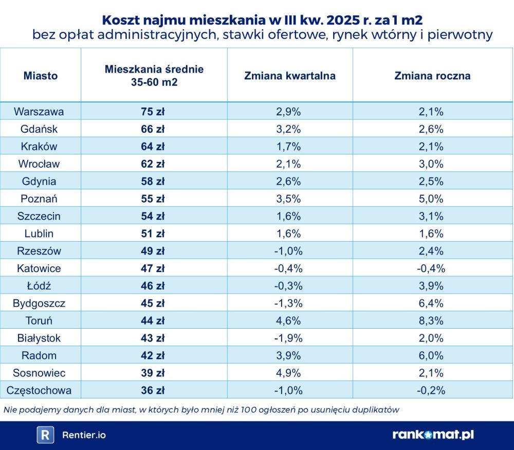Stawki za najem w analizowanych 17 miastach Polski systematycznie rosły przez ostatni kwartał, jednak wzrosty nie były bardzo odczuwalne. W III kw. 2025 r. najem średniego mieszkania (z zakresu od 35 do 60 m2) najwięcej kosztował w Warszawie (75 zł/m2), a ponad dwa razy mniej w Częstochowie (36 zł/ m2).