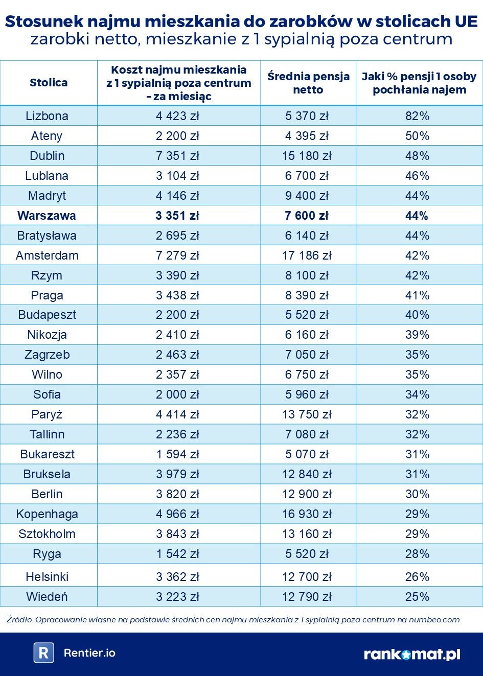 Okazuje się, że najdroższą stolicą na najem jest Lizbona. W stolicy Portugalii trzeba zapłacić średnio 4423 zł za najem mieszkania z jedną sypialnią poza centrum. Przy zarobkach na poziomie 5370 zł oznacza, że Lizbończyk musi przeznaczyć na koszty związane z wynajmem mieszkania aż 82% swoich miesięcznych dochodów. W Warszawie jest znacznie lepiej niż w Lizbonie, bo najem nad Wisłą pochłonie 44% warszawskich dochodów. Identyczny stosunek najmu do zarobków mają Bratysława i Madryt, a nieco gorszy od Warszawy Lublana (46%), Dublin (48%) i Ateny (50%).