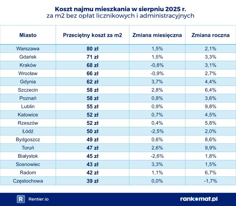 Dane z sierpnia 2025 r. pokazują, że rozpiętość cen najmu w miastach jest wciąż szeroka. Najwięcej trzeba zapłacić w Warszawie – 80 zł za metr kwadratowy. Najmniej w Częstochowie, bo 39 zł/m2, czyli ponad dwa razy mniej niż w stolicy.
