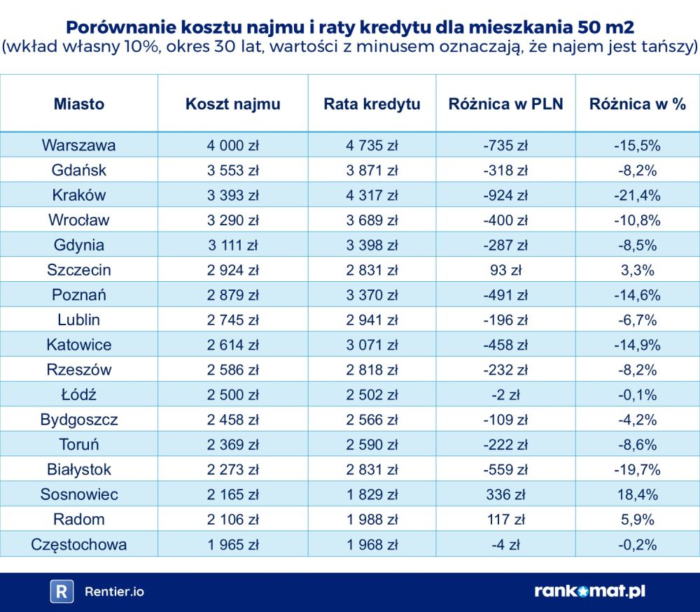 Najem mieszkania 50 m2 w sierpniu 2025 r. kosztował przeciętnie od 1965 zł w Częstochowie do 4000 zł w Warszawie, nie wliczając rachunków. Dla porównania, rata kredytu takiego mieszkania wahała się od 1829 zł w Sosnowcu do 4735 zł w Warszawie. Pomimo obniżek stóp procentowych najem wciąż zwykle jest tańszy niż rata kredytu. Wyjątki to Szczecin, Sosnowiec i Radom. Najlepiej wypadł Sosnowiec, gdzie zapłacilibyśmy 336 zł mniej za ratę w banku niż za najem. Najgorszy stosunek miał Kraków – tam rata kredytu była w sierpniu o 924 zł miesięcznie wyższa od najmu mieszkania.
