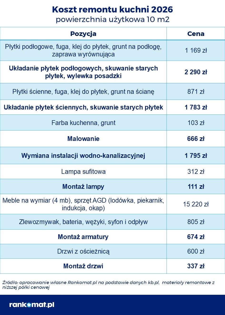 Same materiały kosztują 19 080 zł, z czego najwięcej meble na wymiar (4 metry bieżące) ze sprzętem AGD za ponad 15 tys. zł. Rachunek można obniżyć wybierając gotowe segmenty meblowe, ale takie rozwiązanie nie znajdzie w zastosowaniach w każdej remontowanej kuchni z uwagi na parametry pomieszczenia. Płytki ścienne i podłogowe to kolejne 2 tys. zł.