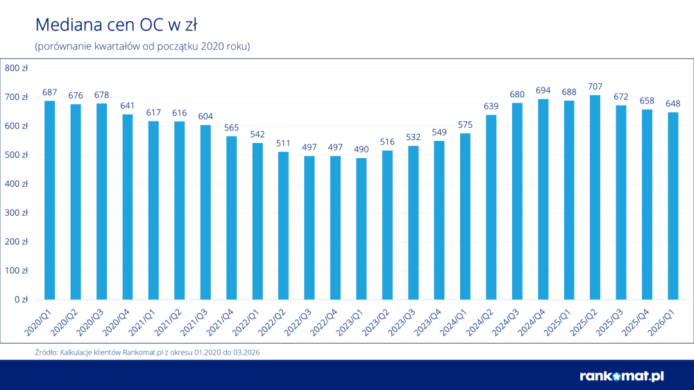 W I kwartale 2026 r. mediana składki OC wyniosła 648 zł. To o 10 zł mniej niż w IV kwartale 2025 r. oraz o 40 zł mniej niż rok wcześniej (688 zł), co oznacza spadek o blisko 6% r/r. Jednocześnie dane miesięczne pokazują odwrócenie trendu – w marcu (652 zł) ceny były już wyższe niż w lutym (643 zł) i osiągnęły najwyższy poziom od listopada ubiegłego roku.