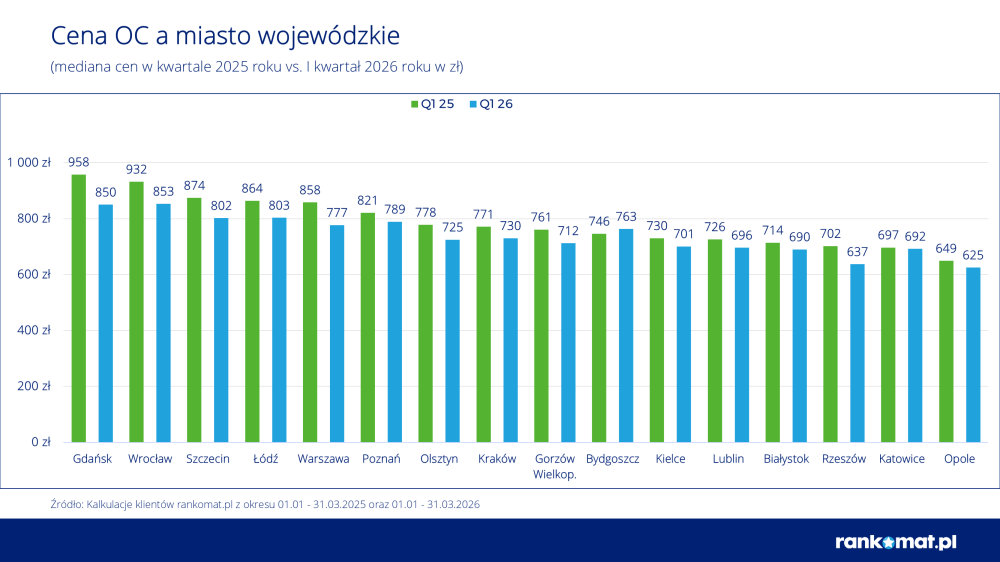 Podobny trend rok do roku widać w miastach wojewódzkich. Najwięcej płacą kierowcy w Gdańsku (850 zł) i Wrocławiu (853 zł), jednak to właśnie tam spadki były największe. Jednocześnie rośnie liczba dużych miast, w których średnia składka spadła poniżej 700 zł – obecnie jest ich już pięć, podczas gdy rok temu były tylko dwa. Najtańsze OC mogli kupić kierowcy w Opolu (625 zł wobec 649 zł rok wcześniej, -24 zł), Rzeszowie (637 zł wobec 702 zł, -65 zł) oraz Katowicach (692 zł wobec 697 zł, -5 zł).