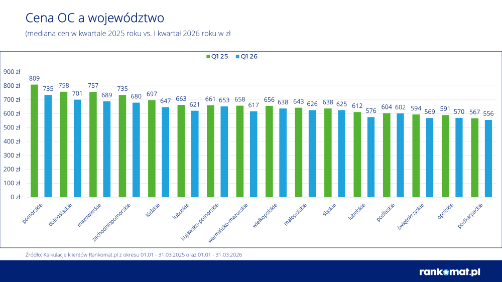 Choć ceny rok do roku spadły we wszystkich województwach, najmocniejsza korekta objęła regiony dotychczas najdroższe. W województwie pomorskim mediana składki wyniosła 735 zł (o 74 zł mniej r/r), na Dolnym Śląsku 701 zł (-57 zł), a w Mazowieckiem 689 zł (-68 zł). Najtańsze OC pozostaje w Polsce południowo-wschodniej – na Podkarpaciu (556 zł), w woj. opolskim (570 zł) i świętokrzyskim (569 zł).