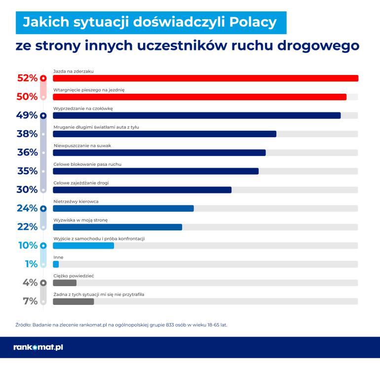 Blisko połowa ankietowanych (49%) spotkała się z wyprzedzaniem „na czołówkę” przez pojazd nadjeżdżający z przeciwka. Z kolei 38% było oślepianych długimi światłami przez auta jadące z tyłu, a 36% nie zostało wpuszczonych podczas jazdy na tzw. suwak. Celowego blokowania drogi doświadczyło 35% uczestników badania, a zajeżdżania drogi – 30%. Nietrzeźwego kierowcę spotkało 24% osób, natomiast 22% usłyszało obelgi ze strony innych kierujących. Co dziesiąty kierowca został sprowokowany do konfrontacji przez innego uczestnika ruchu, który w tym celu wyszedł z pojazdu. Jedynie 7% badanych szczęśliwców deklaruje, że nie ma żadnych złych doświadczeń związanych z poruszaniem się po polskich drogach.