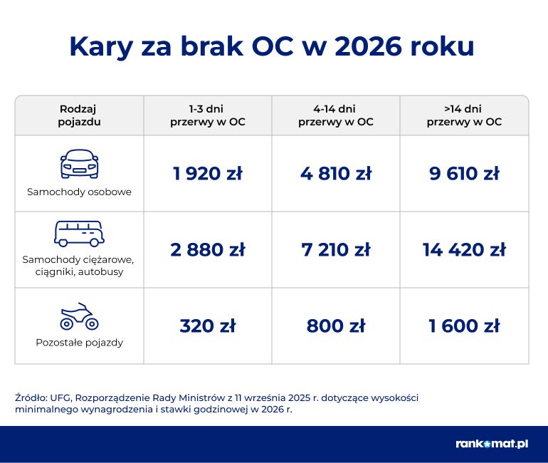 Obowiązkową polisę OC należy wykupić najpóźniej w dniu rejestracji przyczepu w urzędzie. Jeśli zarejestrujesz pojazd, ale do czasu zakupu OC minie choćby jeden dzień, musisz liczyć się z karą nałożoną przez Ubezpieczeniowy Fundusz Gwarancyjny. W 2026 roku taka drobna przerwa może Cię kosztować 320 zł.