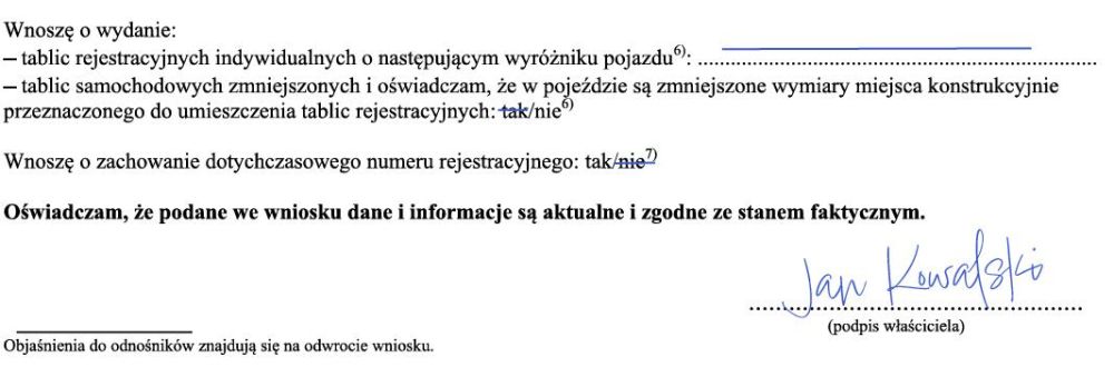 Jeżeli pojazd jest wyposażony w zmniejszone miejsce na tablice, można ubiegać się o wydanie zmniejszonych tablic rejestracyjnych. W tej części wniosku o rejestrację auta należy też podać wyróżnik, gdy auto ma mieć indywidualne tablice rejestracyjne. Żądać pozostawienia dotychczasowych tablic mogą nabywcy używanych pojazdów.