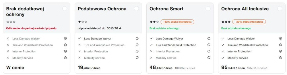 - podczas rezerwacji wybranego modelu przez stronę internetową wypożyczalni – po wyborze pojazdu pojawi się lista dostępnych pakietów ubezpieczeń, które można na spokojnie przeanalizować;
